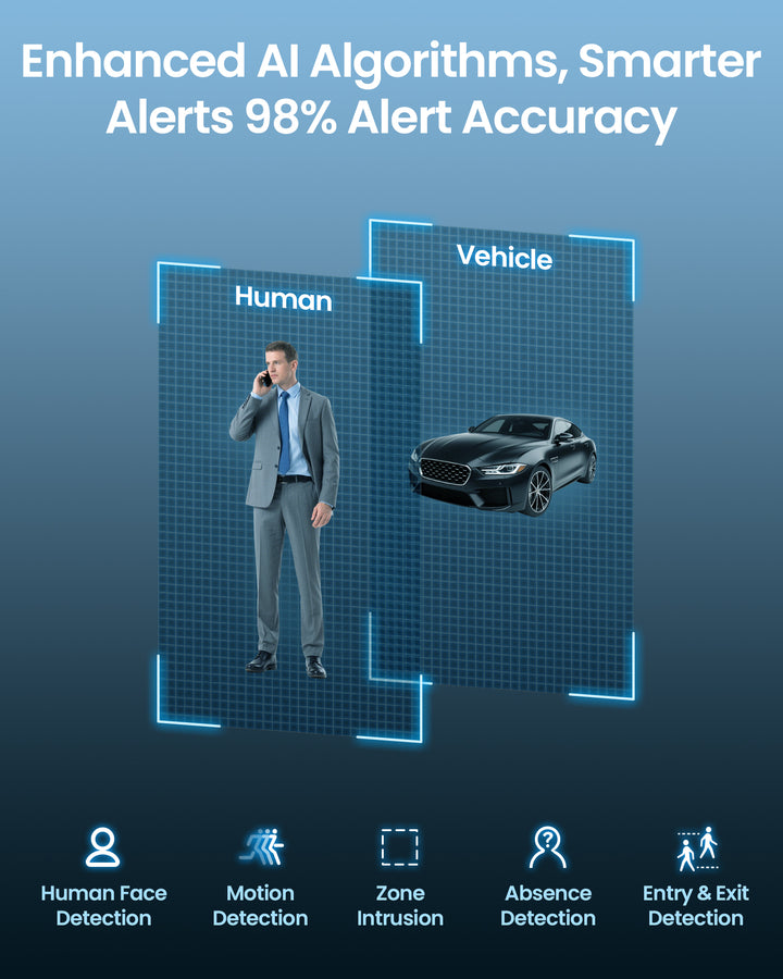 • Person/Vehicle Detection: This camera features cutting-edge AI detection, precisely recognizing individuals, vehicles. Tailor alert zones to minimize unnecessary notifications. Upon detecting human motion, the camera activates both audible and visual alerts, promptly notifying you through our app and email.
