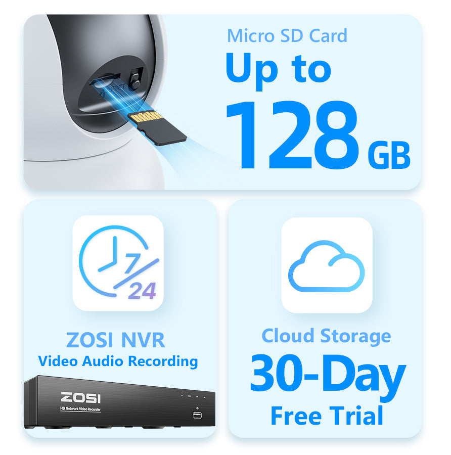 Store the videos on SD card(max 256GB), connect the camera to NVR for extended recording, or upload to Cloud for secure backups.